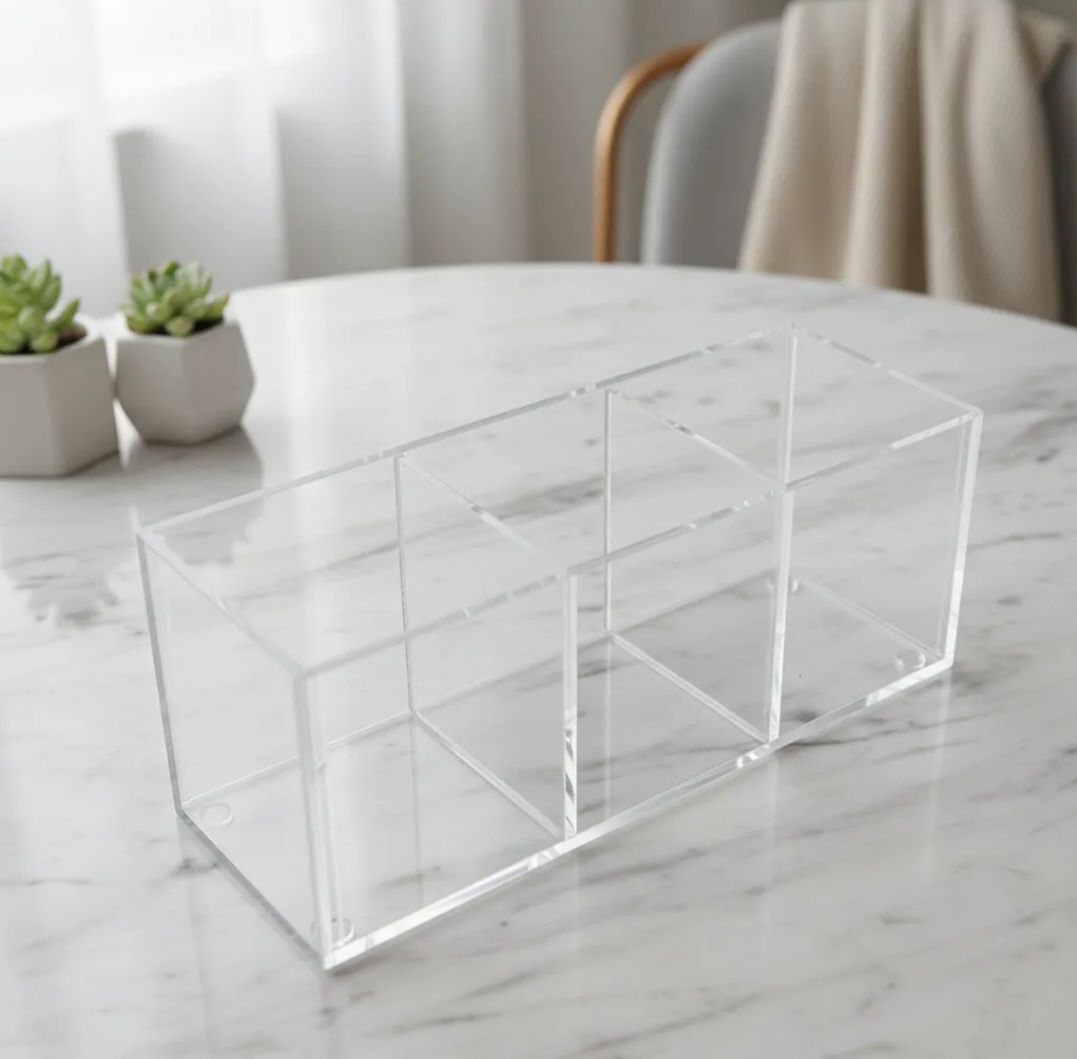Feita em acrílico transparente, com 3mm de espessura e pés de silicone.