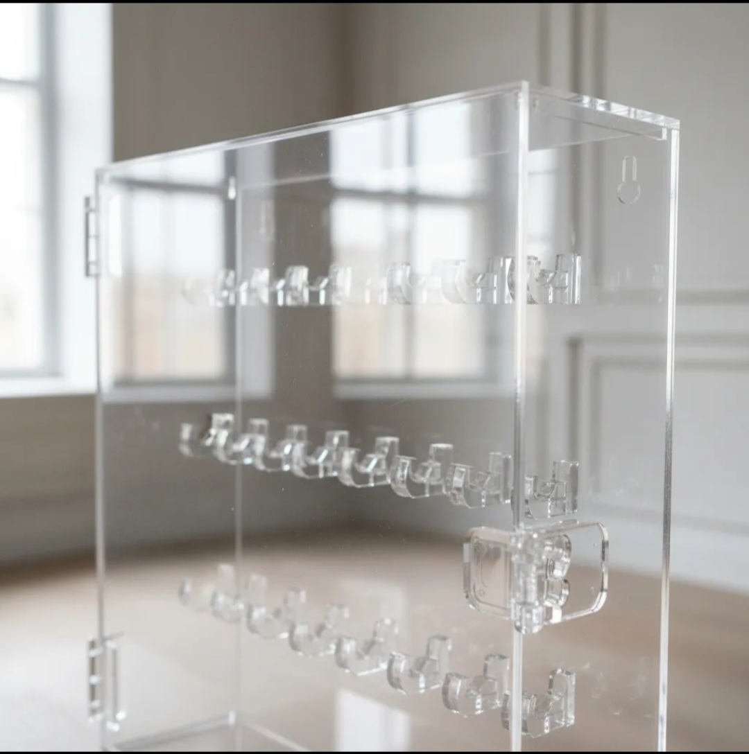 Fabricado em acrílico transparente, garantindo durabilidade e proteção.